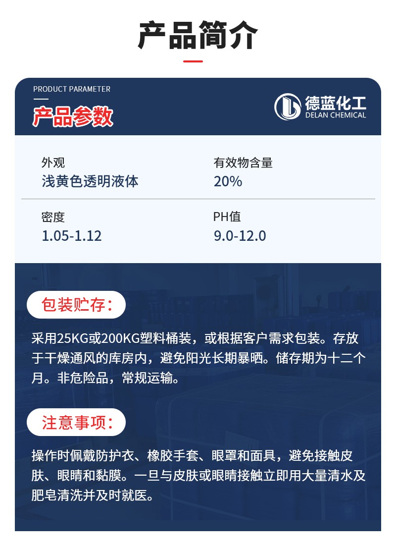 包装储存:采用25kg或200kg塑料桶包装,或按用户要求包装。应储存在阴凉避光处,保质期为一年。