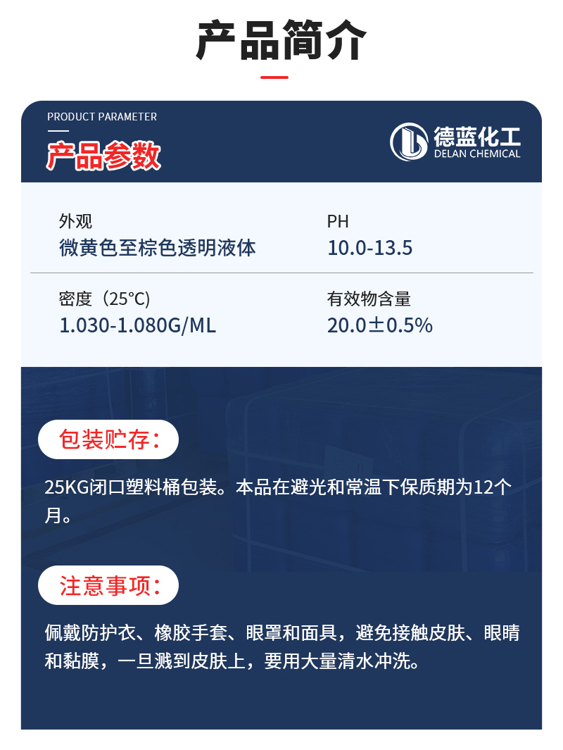 包装储存:采用25kg或200kg塑料桶包装,或按用户要求包装。应储存在阴凉避光处,保质期为一年。