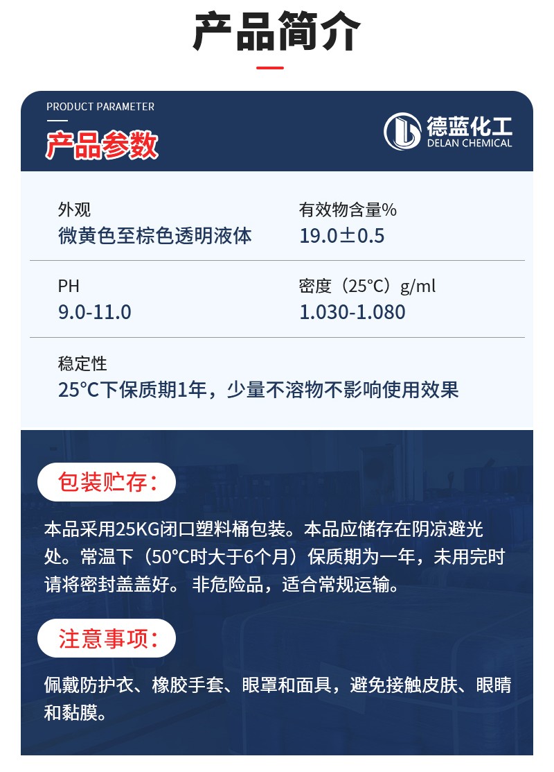 包装储存:本品采用25kg闭口塑料桶包装。 本品应储存在阴凉避光处,常温下(50℃时大于6个月)保质期为一年,未用完时请将密封盖盖好。 非危险品,适合常规运输。