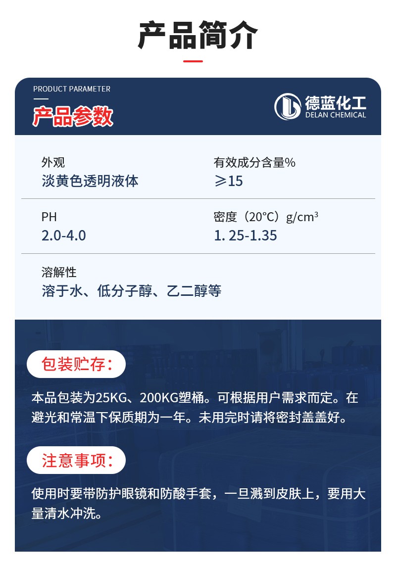 包装储存:采用25kg或200kg塑料桶包装,或按用户要求包装。应储存在阴凉避光处,保质期为一年。