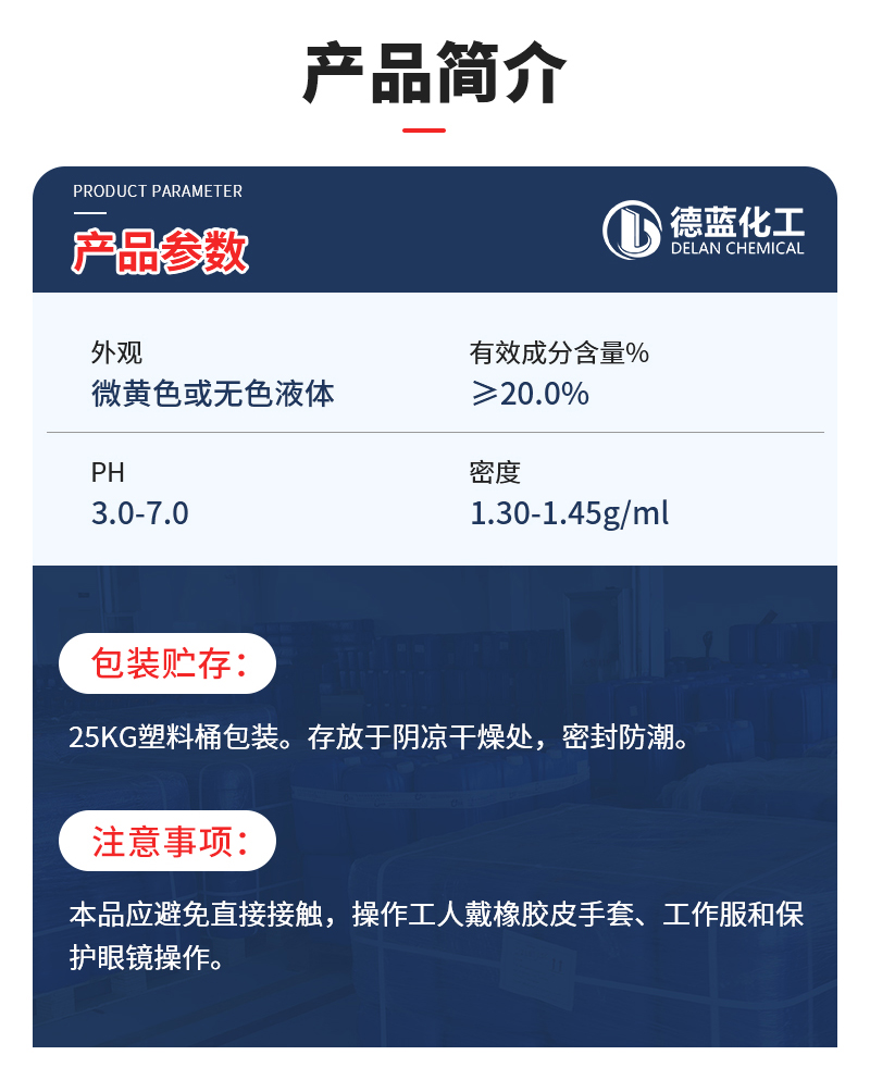 包装储存:采用25kg或200kg塑料桶包装,或按用户要求包装。应储存在阴凉避光处,保质期为一年。