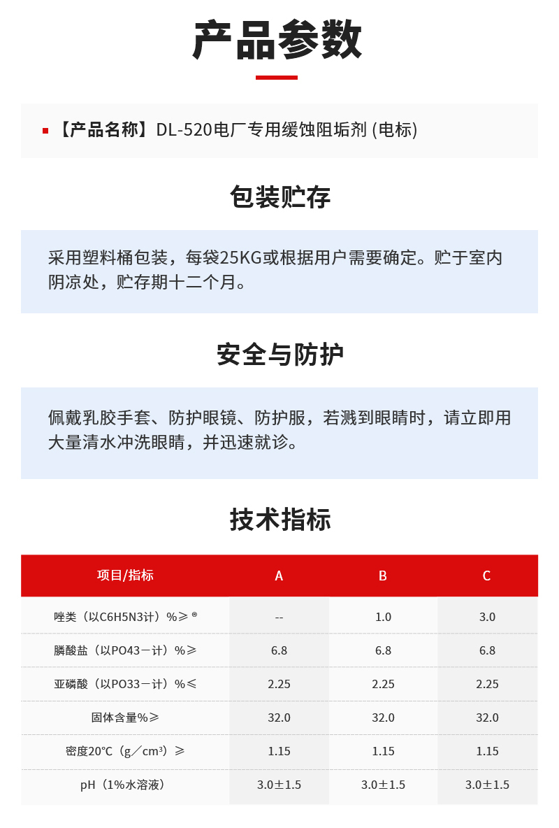 包装储存:三、缓蚀阻垢剂DL-520采用塑料桶包装,每袋25kg或根据用户需要确定。贮于室内阴凉处,贮存期十二个月。