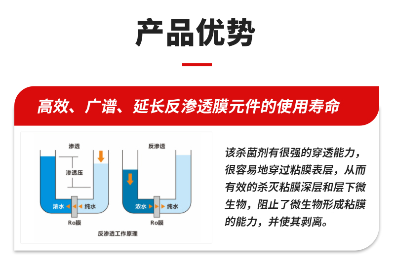 DL-381反渗透杀菌剂是非氧化性杀菌剂,对微生物细胞具有极强的穿透能力,并对微生物的细胞组织产生分解破坏作用,对膜系统设备中细菌、真菌、藻类等微生物有极强的杀灭和抑制作用。...