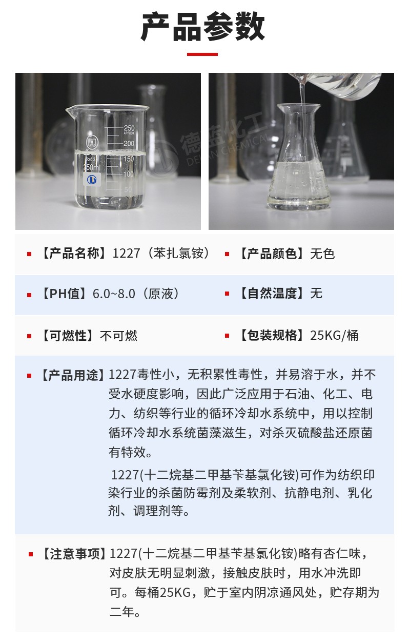 1227是一种阳离子表面活性剂,属非氧化性杀菌剂,具有广谱、长效的杀菌灭藻能力,能有效地控制水中菌藻繁殖和粘泥生长,并具有良好的粘泥剥离作用和一定的分散、渗透作用,同时具有一定的去油、除臭能力和缓蚀作用。...