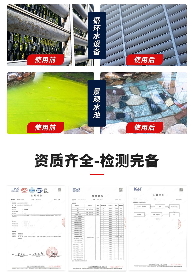 简介 淄博某工厂使用我们的中央空调专用缓释阻垢剂来清理污垢,杀菌灭藻,使用过后反馈很好。本产品为中央空调循环水专用,具有良好的阻垢、缓蚀分散性能,与常用的杀菌灭藻剂相容性好,药剂热稳定性.....