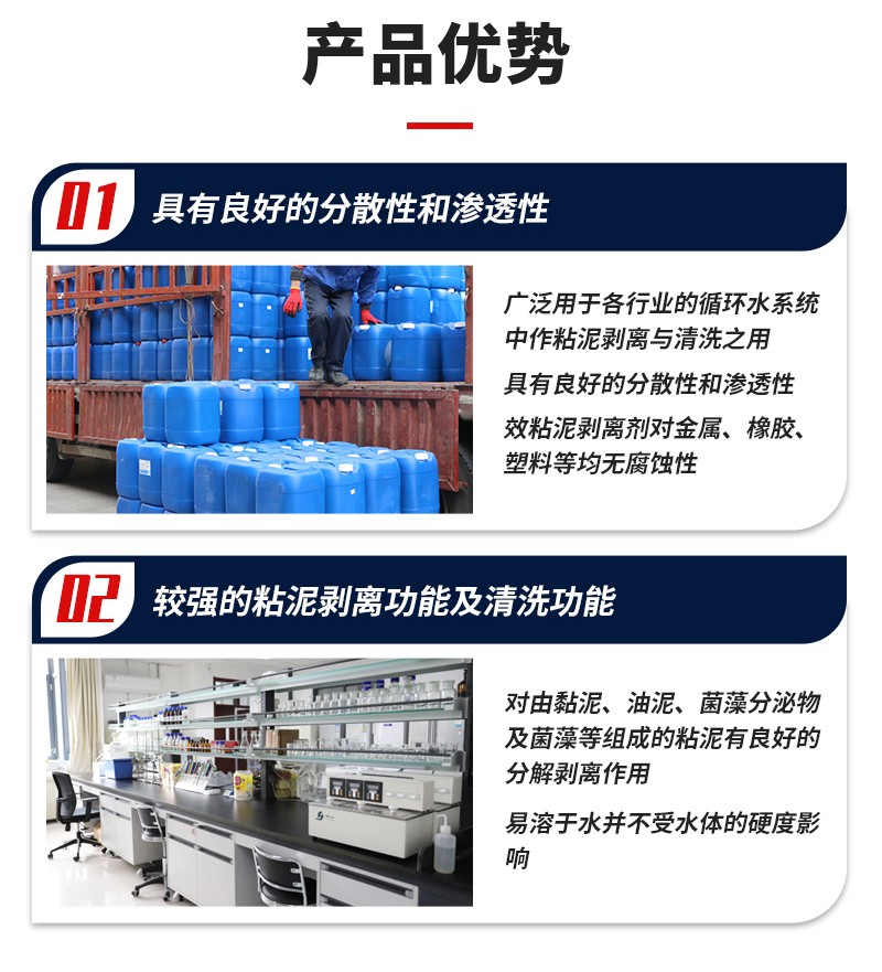 粘泥剥离剂是由高效阳离子表面活性剂、强力渗透剂和分散剂等复合而成,具有广谱、高效的杀菌灭藻能力和较强的粘泥剥离功能及清洗功能。具有良好的分散性和渗透性,其穿透力强、毒性低,作用快,对由黏泥、油泥、菌藻分泌物及菌藻等组成的粘泥有良好的分解剥离作用。同时还具有软化和清洗金属表面的陈垢、缓蚀和提高设备换热率的作用。...