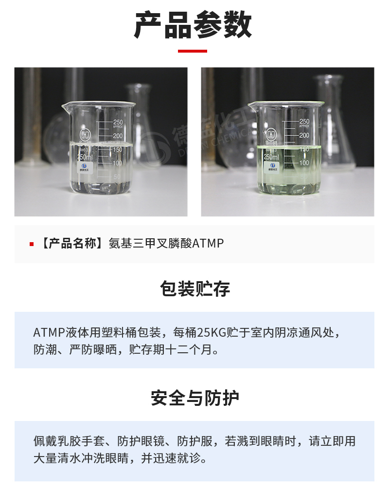 包装储存:ATMP液体用塑料桶包装,每桶25kg,也可根据用户需要确定。贮于室内阴凉通风处,防潮、严防曝晒,贮存期十二个月。