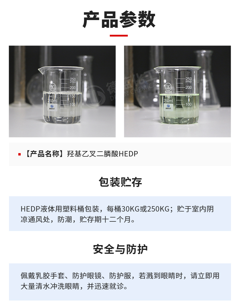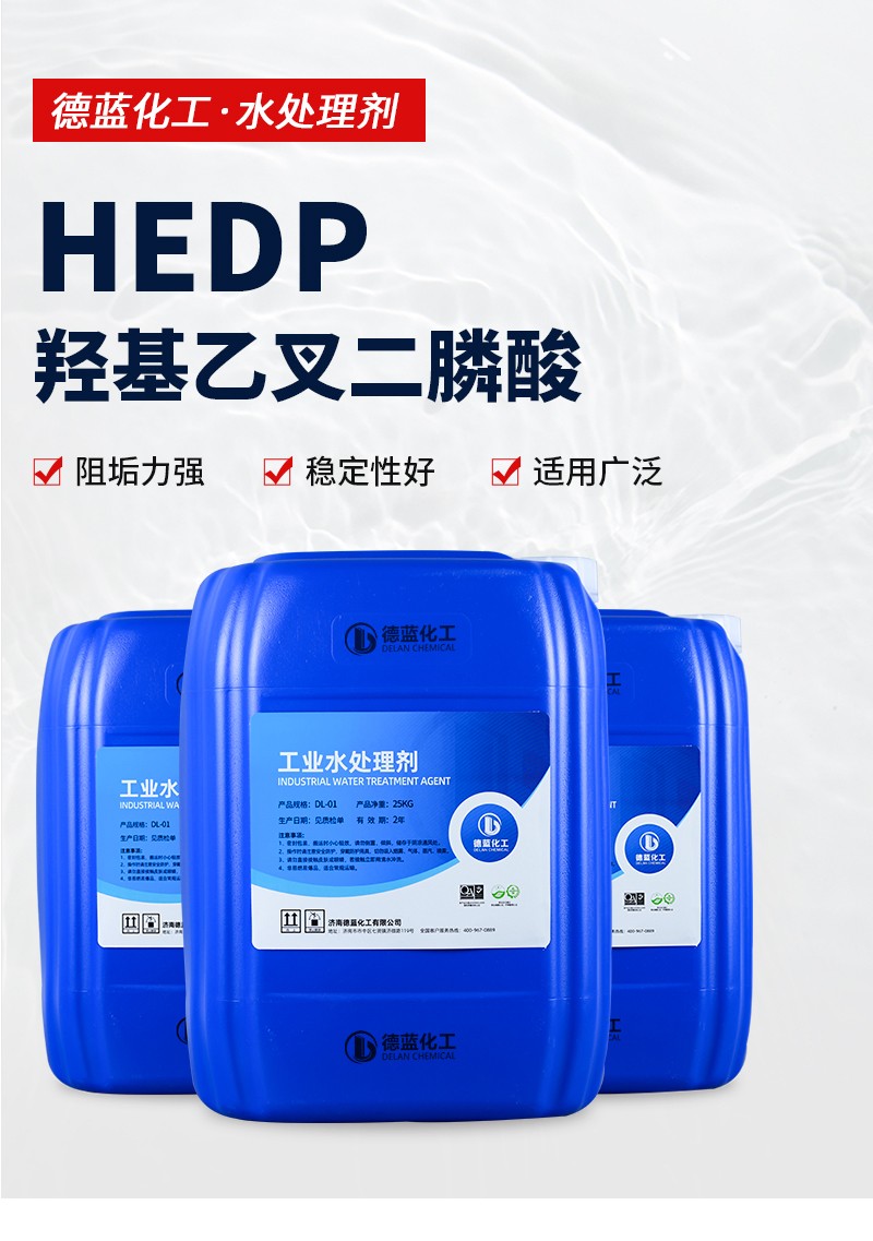 HEDP是一种有机膦酸类阻垢缓蚀剂,能与铁、铜、锌等多种金属离子形成稳定的络合物,能溶解金属表面的氧化物。在250℃下仍能起到良好的缓蚀阻垢作用,在高pH下仍很稳定,不易水解,一般光热条件下不易分解。耐酸碱性、耐氯氧化性能较其他有机膦酸(盐)好。可与水中金属离子,尤其是钙离子形成六圆环螯合物,因而具较好的阻垢效果并具明显的溶限效应,当和其他水处理剂复合使用时,表现出理想的协同效应。...