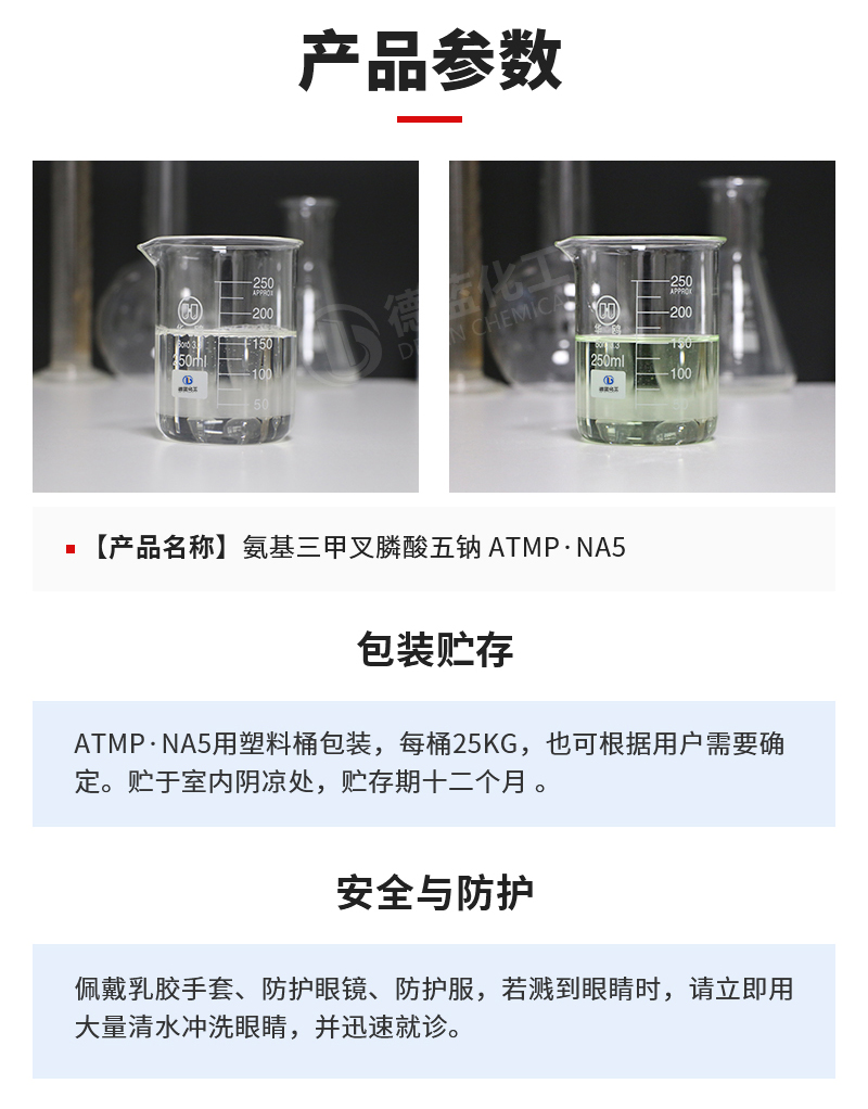 包装储存:ATMP·Na5用塑料桶包装,每桶25Kg,也可根据用户需要确定。贮于室内阴凉处,贮存期十二个月。