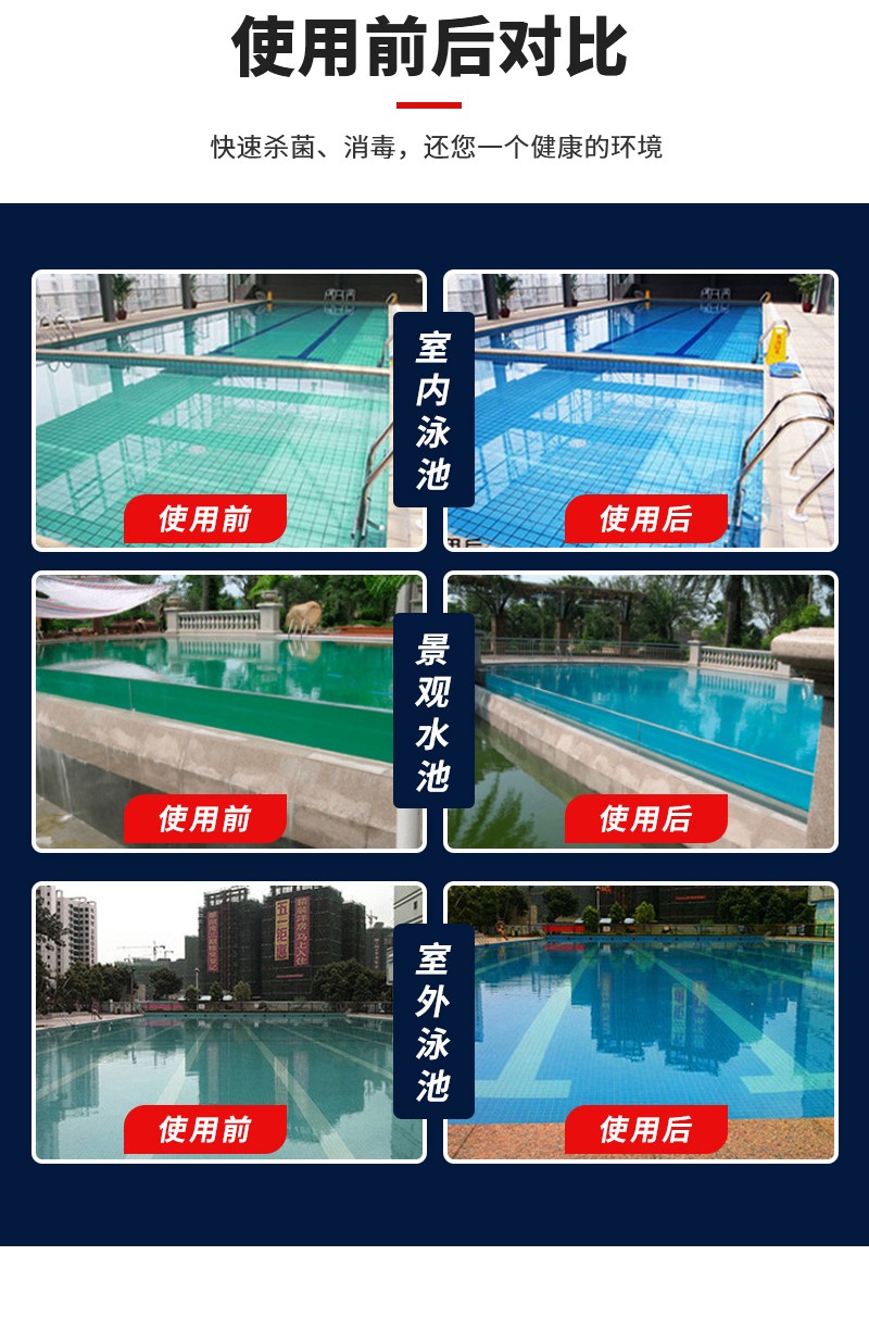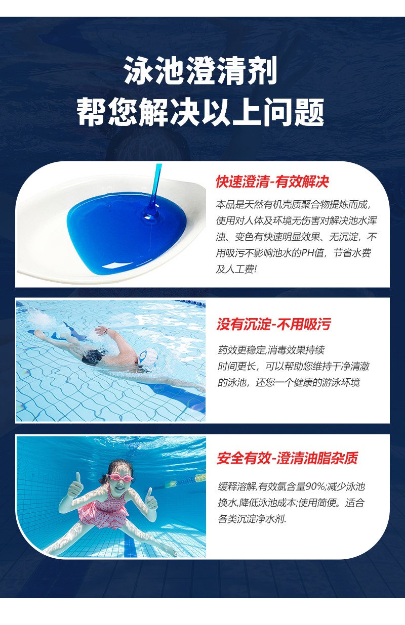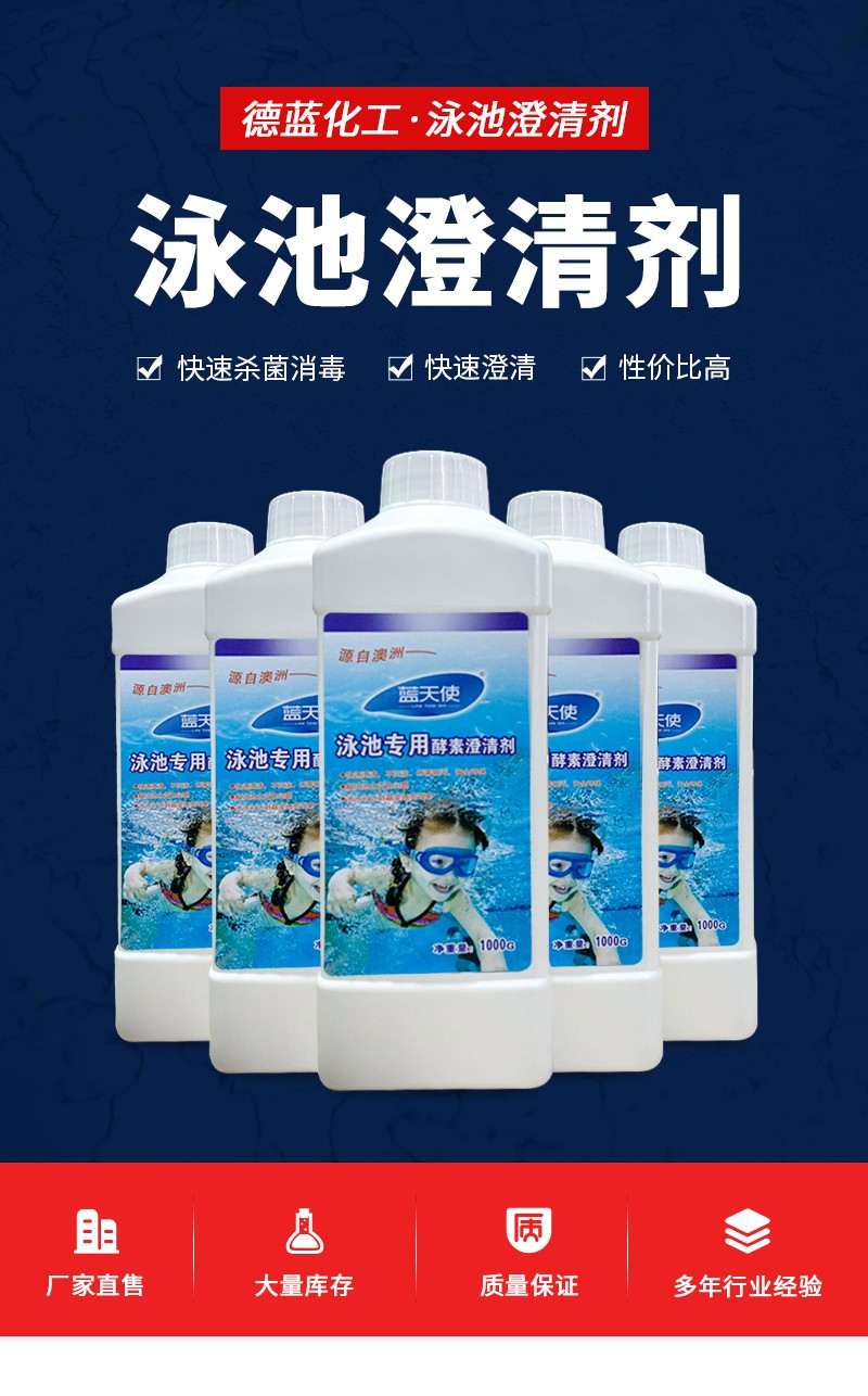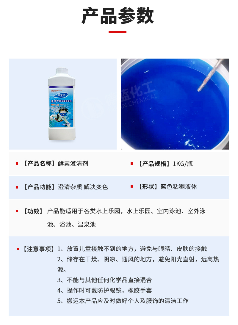 本品对解决池水浑浊,变白、绿、黄等颜色的问题,具有立竿见影的效果。没有沉淀,不用吸污,不影响池水的pH值,节省水费及人工费。蓝天使酵素澄清剂是在酵素澄清剂基础上改良的水质澄清剂,用量更少,效果更好。可在机房用加药器投加,也可以往泳池直接投加,是PAC等沉淀剂的理想替代品。使用前请摇一摇,避免胶质分离。...
